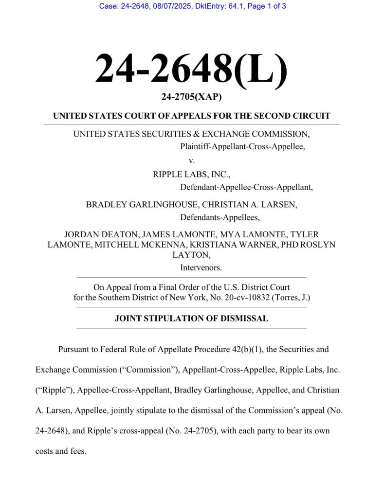Le 7 août 2025, Ripple Labs et la SEC ont déposé une requête conjointe pour retirer leurs appels auprès de la Cour d’appel du Second Circuit. Ce geste marque la fin définitive d’un litige qui durait depuis 2020. Chaque partie paiera ses propres frais, ce qui scelle un accord sans vainqueur dans le dossier, mais quand même avec un grand gagnant : le marché du XRP.