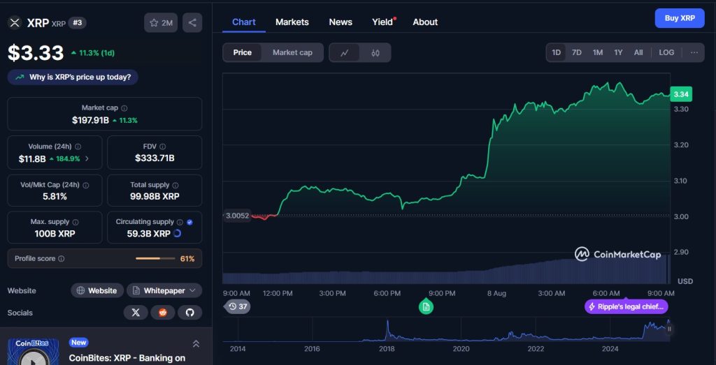 À peine la nouvelle tombée, le prix du XRP s’est envolé d’environ 10 %, atteignant un pic à 3,34 $. Les volumes d’échanges ont explosé, preuve que les traders attendaient ce moment avec impatience.
