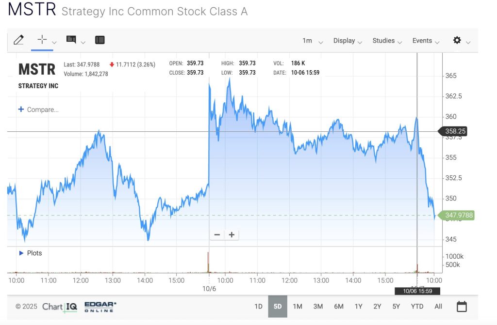 La société pourrait profiter de cette trêve pour réévaluer sa dette et préparer une nouvelle émission obligataire convertible d’ici la fin de l’année. Sur les marchés, la réaction a été mesurée. L’action Strategy (MSTR) a reculé d’environ 3 % après l’annonce (de 359 $ à 348 $). Ce léger repli montre davantage une prise de bénéfices qu’un doute sur la stratégie de long terme. Par ailleurs, le titre restait stable sur la semaine.