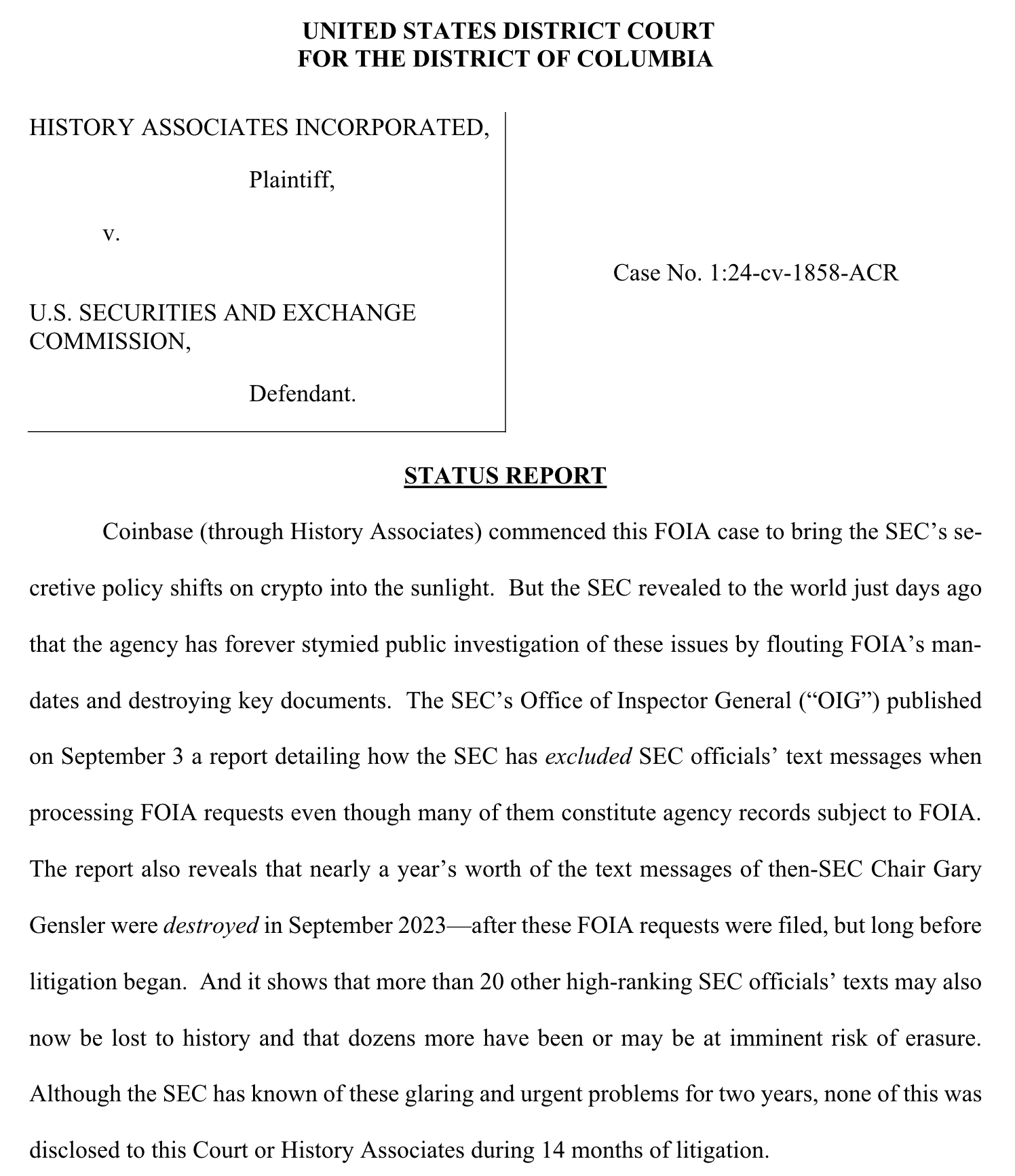 Coinbase relance l’offensive judiciaire contre le régulateur américain après la révélation d’un trou noir dans les communications de l’ex-président de la SEC, Gary Gensler. Selon un rapport publié le 3 septembre par l’Inspecteur général (OIG) de la SEC, près d’un an de messages texte envoyés et reçus par Gensler entre le 18 octobre 2022 et le 6 septembre 2023 ont été perdus à la suite d’une chaîne d’erreurs informatiques et d’une politique de “wipe” automatique mal comprise.