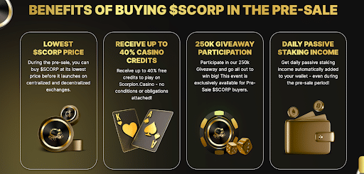 $SCORP est encore en phase de prévente, ce qui permet aux investisseurs de s’emparer du jeton à des prix intéressants. Par exemple, le prix du jeton est actuellement de 0,028 $. Son prix de cotation prévu, quant à lui, est de 0,05 $. Cette grande différence laisse une grande marge de manœuvre pour les retours sur investissement des premiers investisseurs. Et ce, avant le lancement du jeton.
