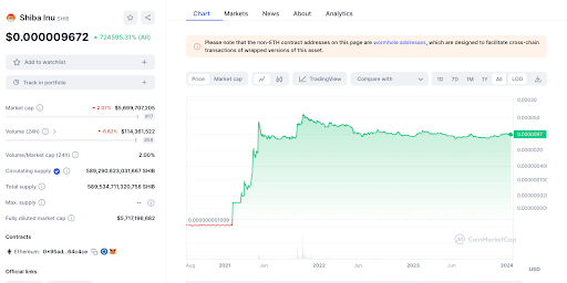 Shiba Inu est l’une des plus grands mèmes coins de l’histoire de la crypto-monnaie. Pourtant, ses débuts ont été modestes. Selon CoinMarketCap, elle a augmenté de 723508,69% au fil des ans. Il s’agit là d’une performance stupéfiante.