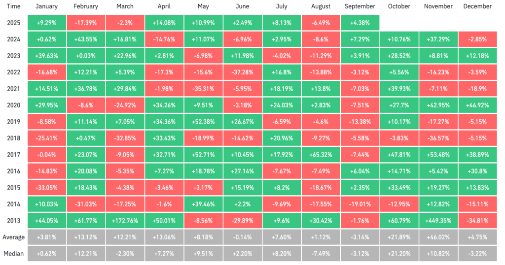 Depuis plus d’une décennie, le mois de septembre affiche un bilan moyen négatif pour le bitcoin. La performance moyenne tourne autour de -3,2 % sur dix ans, contre +22,5 % en octobre. Cette saisonnalité nourrit alors le narratif d’un « Uptober », expression souvent relayée dans la communauté crypto.