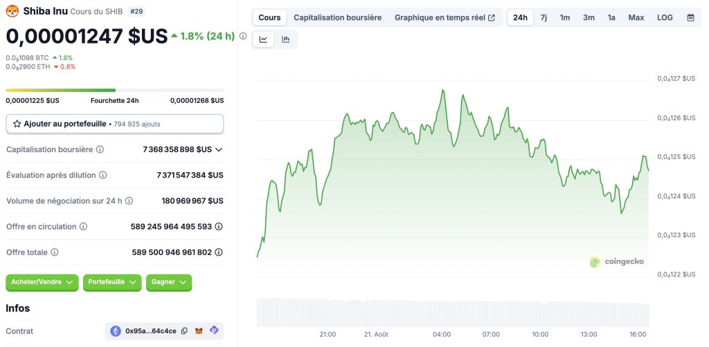Au cours des dernières 24 heures, Shiba Inu (SHIB) a évolué entre 0,00001206 $ et 0,00001268 $. Son prix reste ancré autour de 0,000013 $, un seuil considéré comme critique par les analystes techniques. Si ce niveau venait à céder, une nouvelle correction vers 0,000011 $ pourrait s’enclencher. À l’inverse, une percée au-delà de 0,000014 $ ouvrirait la voie à une reprise plus soutenue.