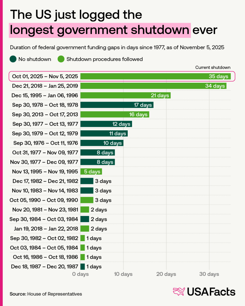 Finalement, la situation se débloque, après plusieurs semaines dans cette situation. D’après les données de USAFacts, à date du 5 novembre dernier, le shutdown de 2025 fut le plus long de l’histoire des États-Unis.