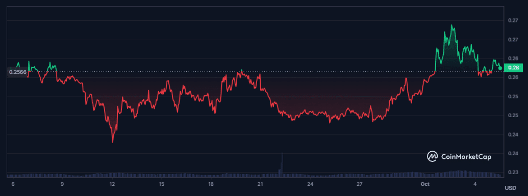 Au cours de la semaine dernière, la situation du prix de Cardano a connu une hausse impressionnante de 5,38 %, s’établissant à 0,257 $ ce jeudi. En dépit de la régression observée chez les principales crypto-monnaies Bitcoin et Ethereum suite à leur soudaine hausse de prix, Cardano a plutôt démontré une résilience conséquente.