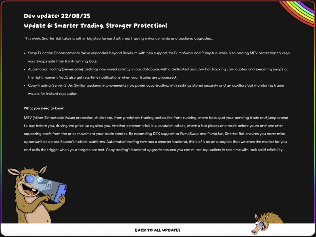 Les dernières mises à jour montrent que la feuille de route de SNORTER devient réalité. On peut évoquer ses fonctionnalités comme la protection MEV, le copy trading automatisé ainsi que le support élargi aux DEX.