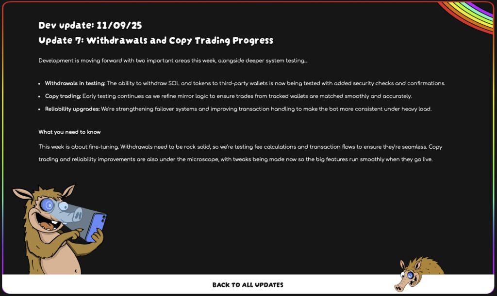 Le copy-trading est aussi en test initial. L’équipe a amélioré le copy-trading afin que les transactions des portefeuilles suivis soient reproduites de manière plus fluide et plus précise.
