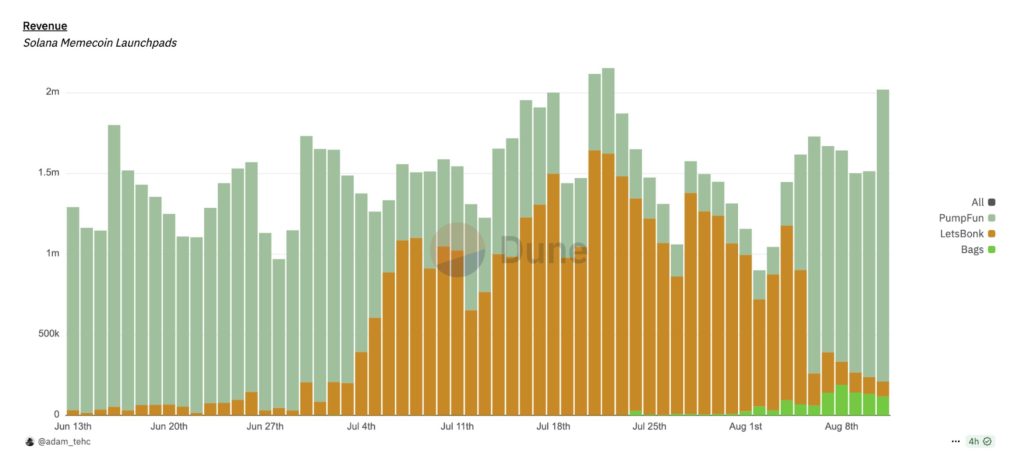 Ce revirement se produit après un mois durant lequel LetsBonk, un launchpad de Solana créé par la communauté BONK, était en tête, tant en nombre de jetons lancés qu’en revenus. Du 6 juillet au 6 août 2025, LetsBonk a généré en moyenne 1 million $ de revenus quotidiens. On parlait de 451 000 $ pour Pump.fun.