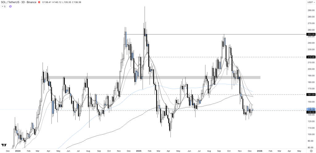 Bien que la blockchain Solana aille de l’avant, cela ne se retranscrit pas forcément dans la dynamique du cours. En effet, depuis ses sommets il y a près d’un an, le cours a perdu plus de 53 % de sa valeur. Oscillant autour des 135 dollars, un support clé à long terme, SOL est en difficulté face au dollar.