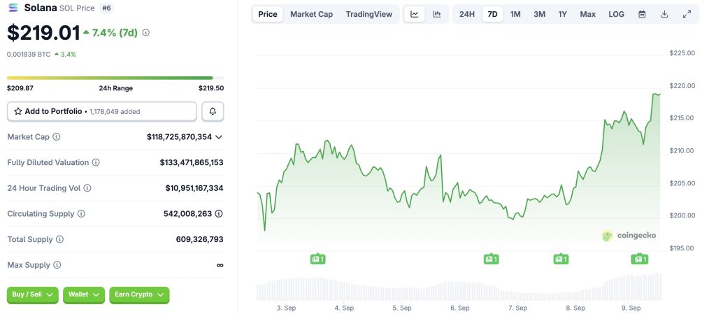 Solana évolue autour de 219 dollars, en hausse de 4 % sur 24 heures. L’actif est dans un moment charnière. Quand on se tourne vers les indicateurs techniques, ils oscillent entre la promesse d’un breakout haussier et la menace d’un repli. Le marché attend un signal clair… Entre prudence et enthousiasme.