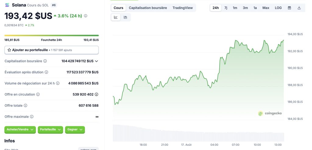 Le cours du SOL a brièvement franchi les 200 $ avant de corriger vers 193 $, en baisse de près de 5 % sur 24 heures. Cette zone est cruciale car elle correspond à un seuil technique scruté depuis plusieurs mois. Tant que Solana échoue à s’y maintenir, la dynamique haussière reste fragile.