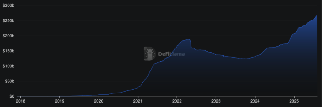 Le bullrun des stablecoins bat son plein. Après une chute de la capitalisation autour des 120 milliards de dollars en 2023, le secteur a regagné en force ainsi qu’en crédibilité par le biais de l’adoption aux États-Unis. D’après les données disponibles sur DeFiLlama, le marché s’approche désormais des 270 milliards de dollars de capitalisation.