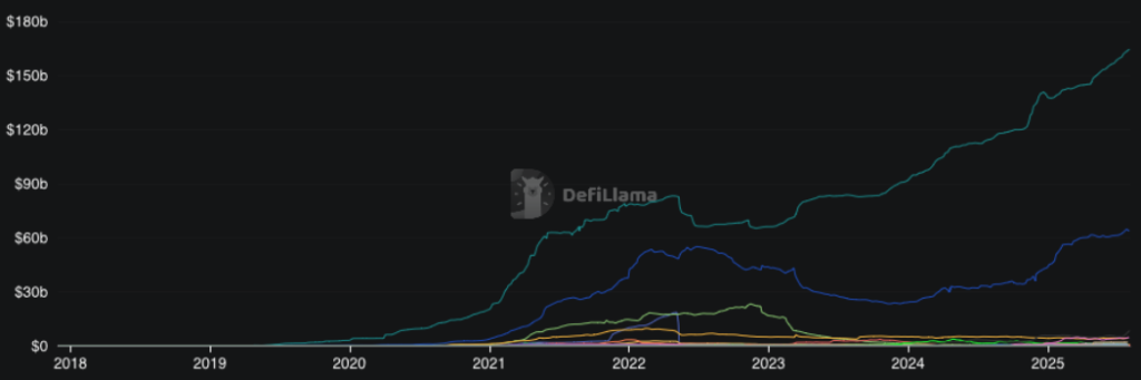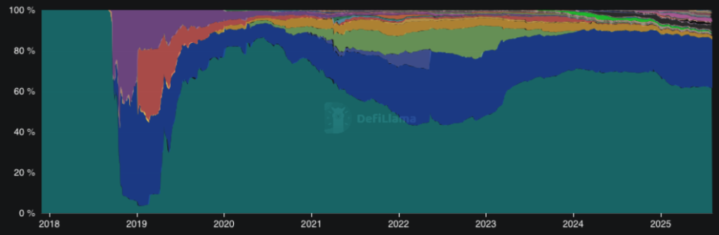 Avec 65 milliards d’USDT on-chain en 2023, Tether a accéléré son déploiement dans la DeFi. Le géan affiche plus de 160 milliards de dollars on-chain à ce jour, ce qui lui permet de préserver la position de leader dans le secteur.