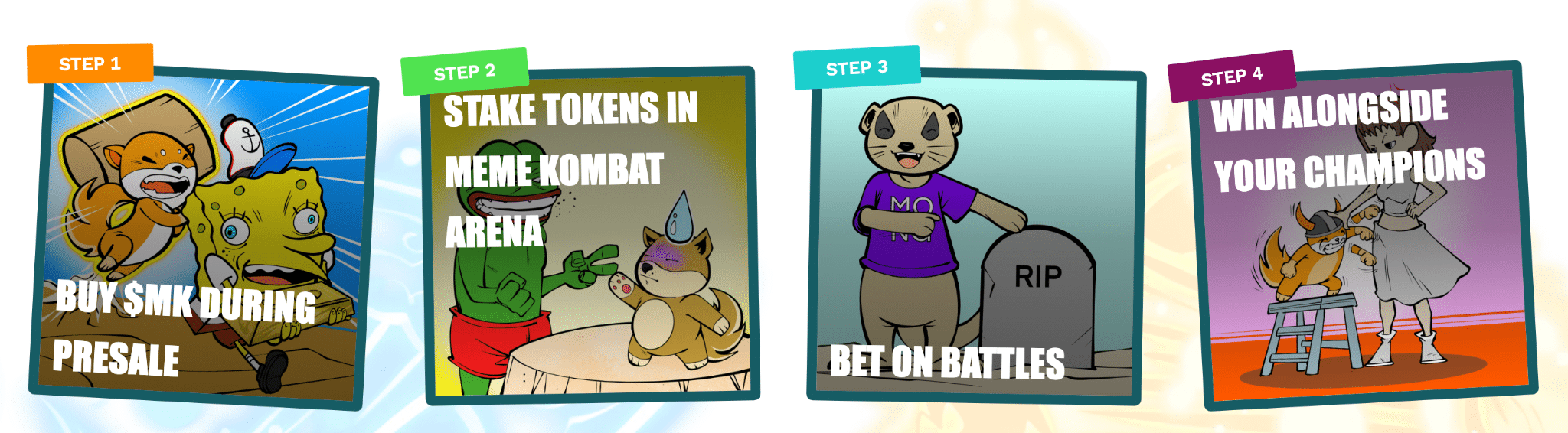 Meme Kombat permet aux détenteurs de jetons de les déposer pour participer aux combats et aux paris. En participant activement sur la plateforme, les joueurs ont l’opportunité de remporter diverses récompenses, en plus de leurs gains potentiels issus des paris sur les combats entre personnages mèmes.