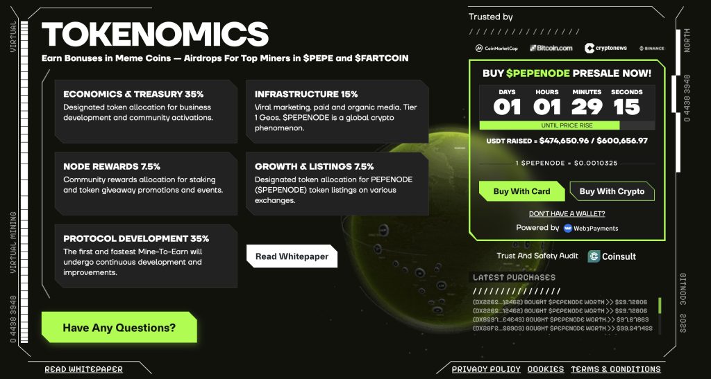 Cependant, avec le retour en force du minage sur le devant de la scène (Entrée en bourse imminente d’American Bitcoin), c’est un projet qui pourrait inscrire de belles performances. Le memecoin $PEPENODE est l’occasion de s’exposer à une narrative à fort potentiel qui dispose de tokenomics solides.