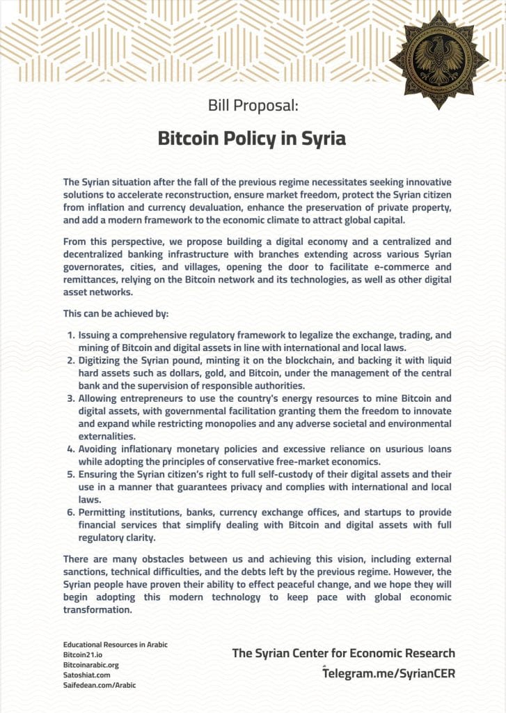 Sur la fin d’année 2024, le centre syrien de recherche économique a publié une proposition de loi s’intitulant “Bitcoin Policy in Syria“. Avant d’évoquer les manières de parvenir à une politique en la matière, cette proposition replace le contexte et évoque différents éléments de compréhension en expliquant qu’il est :