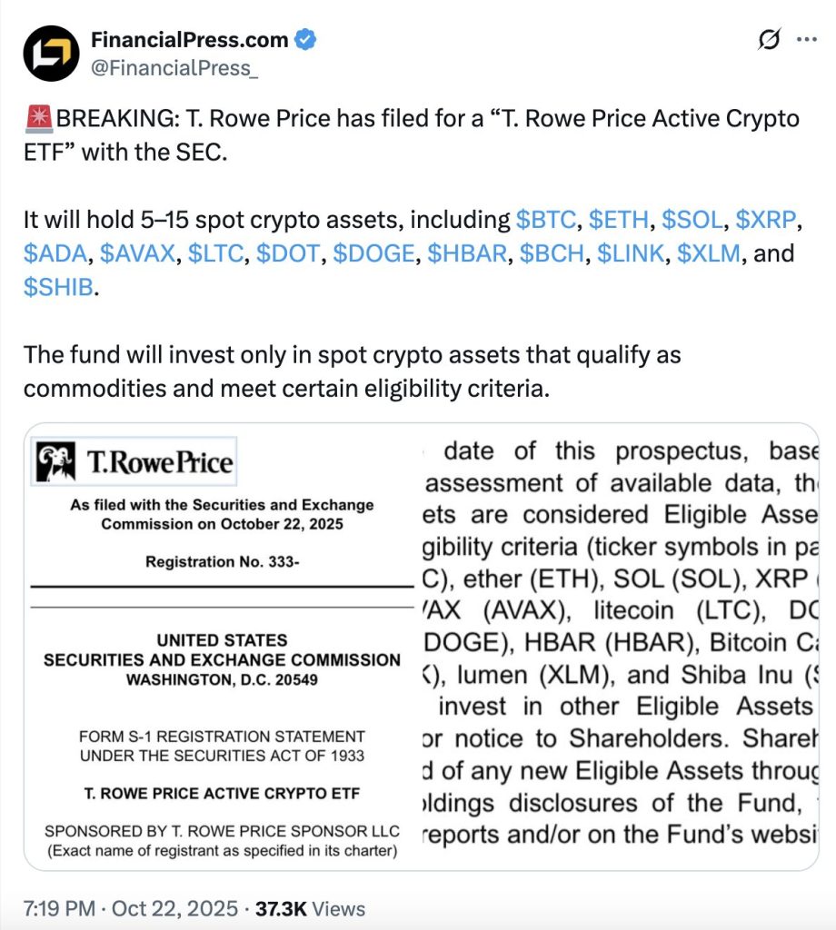 Surprise à Wall Street. T. Rowe Price (1 770 Mds $) a déposé le 22 octobre un formulaire S-1 à la SEC pour lancer un ETF crypto actif. L’objectif : surperformer le FTSE Crypto US Listed Index via une exposition directe à un panier d’actifs numériques, dont Bitcoin, Ethereum, Solana et XRP. Si la SEC l’approuve, le produit serait coté sur NYSE Arca. Le signal est clair, la gestion active entre à son tour dans la course.