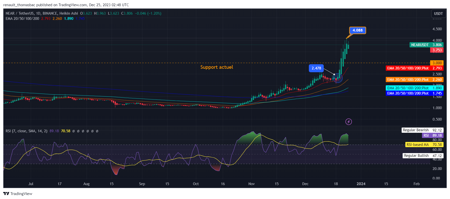 - Résistance : En termes de résistance, le NEAR affronte un niveau critique autour de 4 $, ce qui représente un objectif haussier potentiel. Néanmoins, le Réseau de force relative (RSI) est en position surachetée, ce qui pourrait indiquer un besoin de correction à court terme.