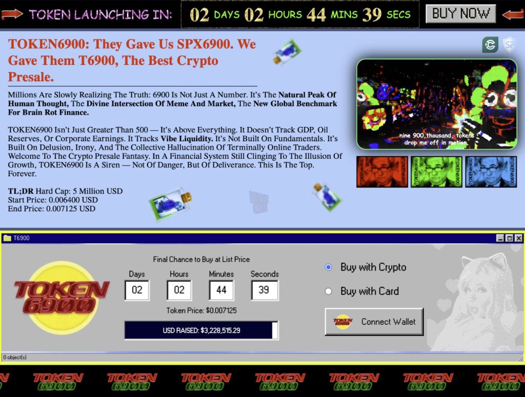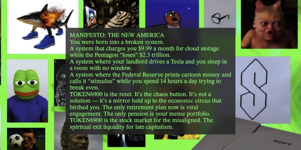 À l’instar du SPX6900, le TOKEN6900 attaque de façon satirique la finance traditionnelle, les décideurs financiers et les banquiers voyous. Ces derniers pensent être les piliers du monde financier. Mais le T6900 est le jeton qui crie haut et fort que tout ce qui est solide finit toujours en poussière et est balayé par le l’air. Alors pourquoi pas ne pas assumer vouloir célébrer le vide que représentent les mème coins de type index coin ?