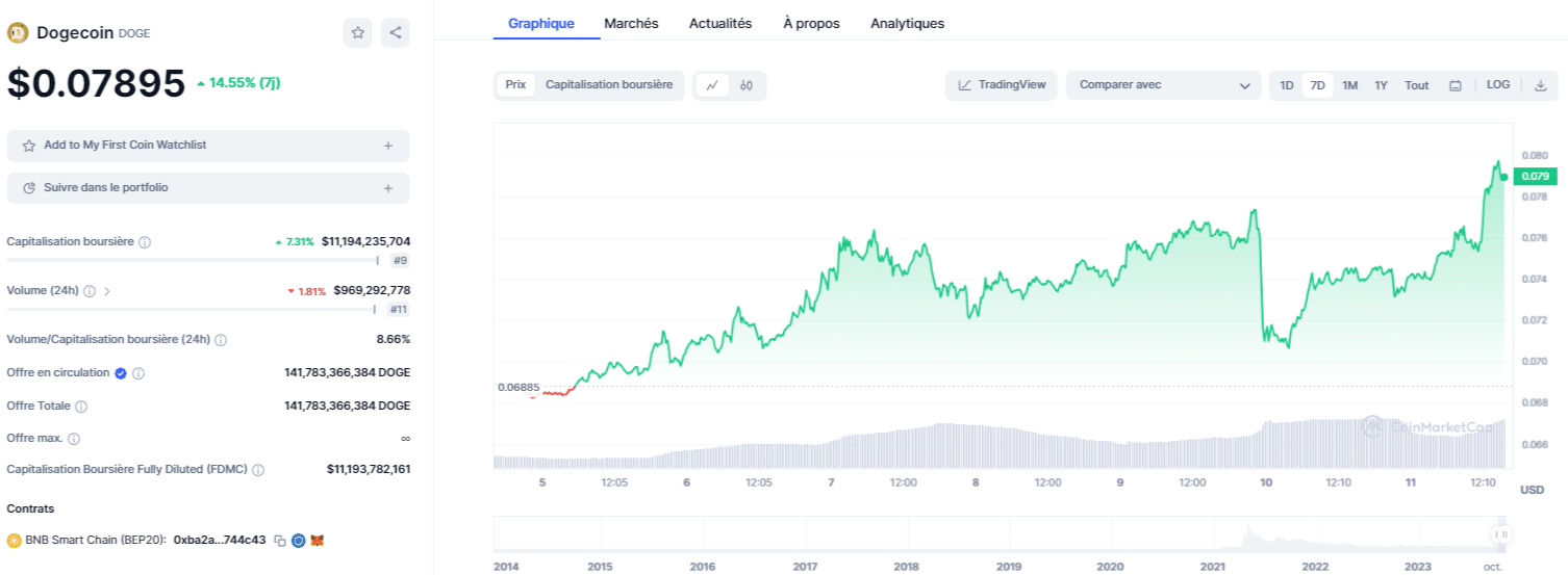Actuellement, le Dogecoin (DOGE) connaît une tendance haussière impressionnante, se négociant à 0,078 $, ce qui représente une augmentation de 14 % au cours de la dernière semaine et un bond considérable de 33 % sur le dernier mois.