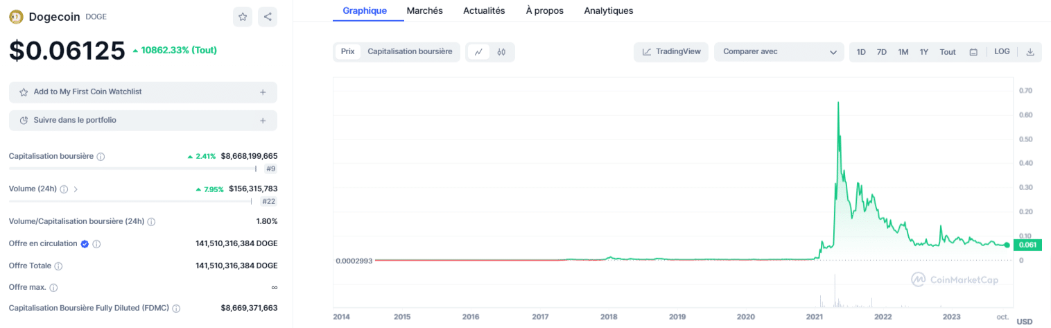 Lorsque l’on regarde en arrière, la performance du Dogecoin est époustouflante, avec une augmentation impressionnante de +10,856.80 % depuis sa création. Ces chiffres démontrent la solidité et la pertinence du Dogecoin dans le paysage crypto, malgré sa nature humoristique.