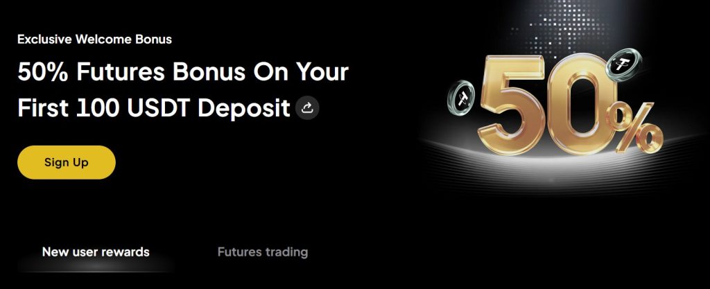 très avantageuse. Lors de votre premier dépôt de 100 USDT, vous recevez automatiquement 50 % de bonus, utilisables sur le marché des futures. Et c’est pas tout : vous bénéficiez de 20% de bonus sur chaque dépôt supplémentaire.