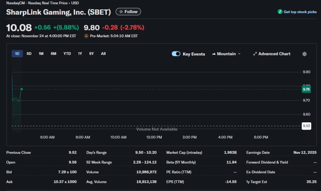 SharpLink avance de façon plus posée, mais son mouvement reste solide. L’action a pris +6 % alors que le marché crypto global ne montait que +2,1 %. Son statut de deuxième plus gros détenteur d’ETH coté attire des investisseurs qui veulent jouer l’écosystème sans acheter d’Ether directement. Et quand on voit qu’ETH reste encore –41 % sous son ATH, on comprend pourquoi ces actions attirent autant.
