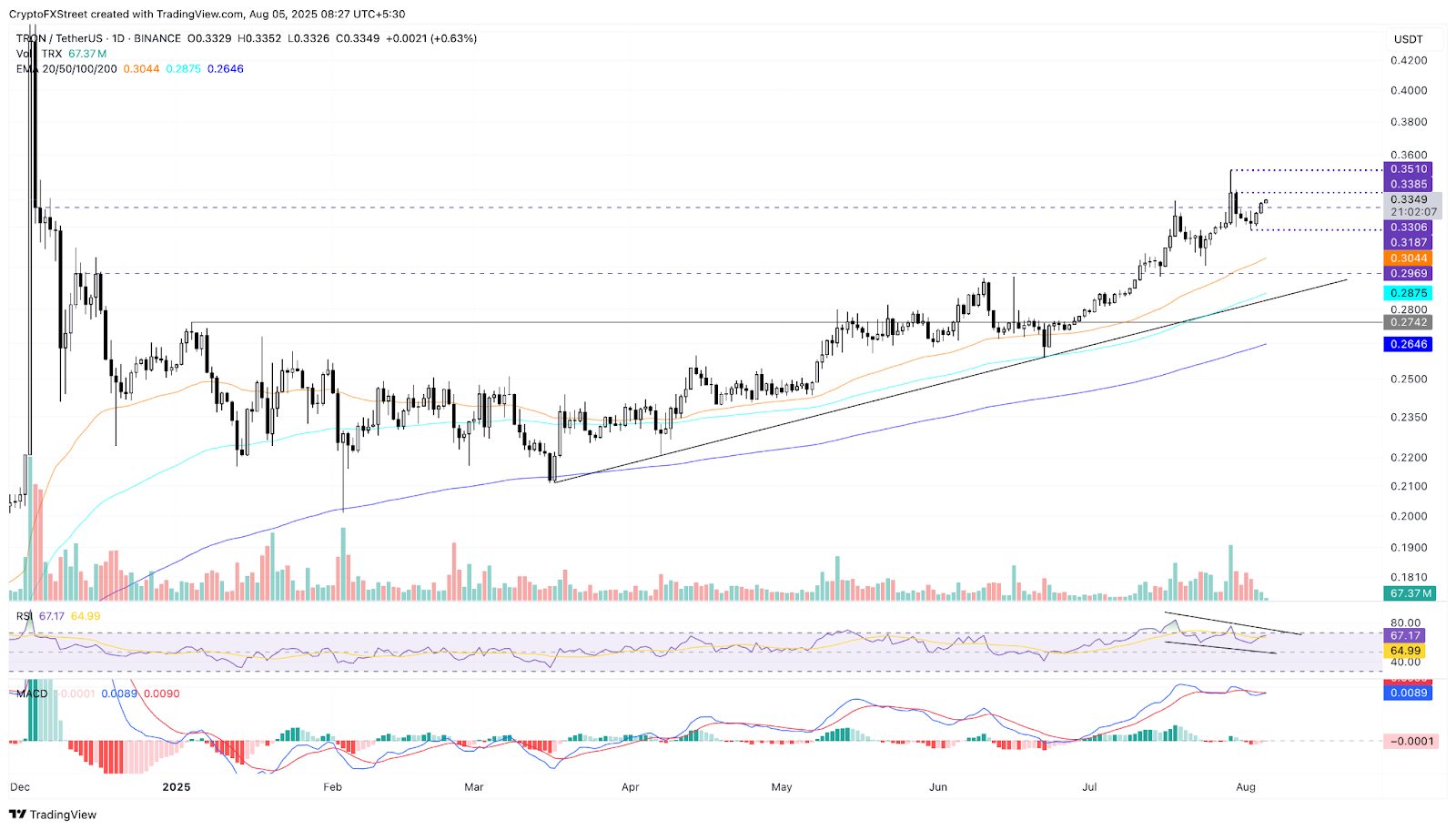 Sur les graphiques, TRON évolue depuis juillet sous une résistance clé autour de 0,34 dollar. Plusieurs tentatives de franchissement ont échoué, mais le prix reste solidement installé au-dessus de la ligne de tendance haussière amorcée au printemps.