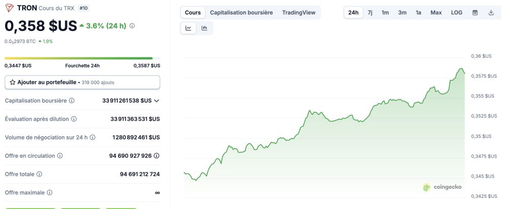 Le gel de 250 M $ en moins d’un an envoie un signal fort aux investisseurs et aux régulateurs. L’USDT reste stable à 1 USD, avec un volume journalier de plus de 45 milliards de dollars. Le TRX s’échange autour de 0,358 USD (+0,03 % sur 24 h). L’impact immédiat sur les marchés reste donc limité.