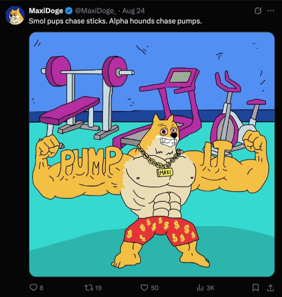 Donc Maxi Doge serre un haltère dans une patte et une app DEX dans l’autre, il pousse de la fonte et traque les charts en simultané. Voilà ce que “all-in” veut vraiment dire. Parce qu’à quoi bon prendre du muscle si ton wallet ne flexe pas aussi ?