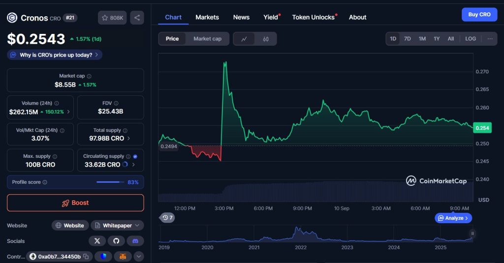 En 24 heures, le volume d’échange a explosé de +150 %, atteignant plus de 260 millions de dollars, selon les données CoinMarketCap. Le prix s’est stabilisé autour de 0,2543 $, après avoir brièvement touché les 0,27 $ juste après l’annonce. La capitalisation boursière du CRO dépasse désormais les 8,5 milliards de dollars, ce qui en fait l’un des top 25 tokens mondiaux.