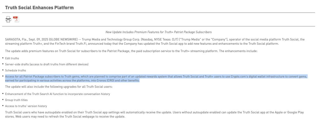 Résultat : les utilisateurs de Truth Social, abonnés à la formule payante « Patriot Package », gagnent des Truth Gems en interagissant sur la plateforme, qu’ils peuvent ensuite échanger contre des CRO.