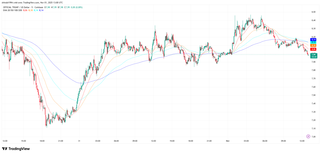 Cela fait plusieurs jours maintenant que le jeton TRUMP fait jaser sur le marché des memecoins. Une progression inexorable qui le fait désormais orbiter autour de 8,70 $. Étrangement, et surtout en l’absence de tout buzz significatif, le souffle haussier semble plutôt bien installé. Désormais, le débat autour des signaux techniques indique une cible : 9 $.