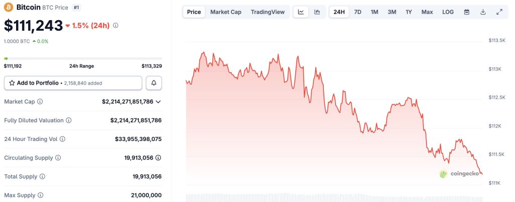 Cette poussée vendeuse a fragilisé un support considéré comme crucial par les analystes. Le bitcoin évolue désormais autour de 111 200 dollars, après avoir touché un pic intrajournalier à 113 419 dollars. Le seuil des 112 000 dollars a été brièvement enfoncé, un signal technique qui alimente les inquiétudes d’un retour vers les 109 000 dollars si la tendance se prolonge.