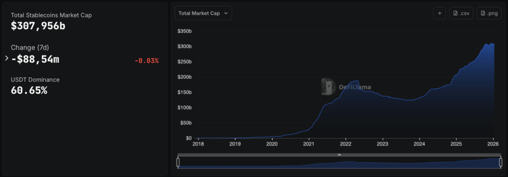 Le constat est simple : les stablecoins sont devenus la couche de liquidité des marchés crypto. Selon les données de marché, la capitalisation totale des stablecoins atteint 307,9 milliards de dollars, avec un volume d’échanges sur 24 heures affiché à 80,3 milliards.
