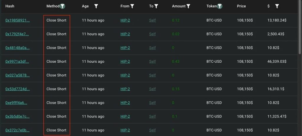 La « insider whale » a donc fermé une série de positions short sur Bitcoin. Elle ne pari plus sur la baisse du BTC. Les données on-chain montre une dizaine de transactions « Close Short », toutes au prix de 108 150 $. Les montants varient, mais le total dépasse plusieurs dizaines de millions de dollars.