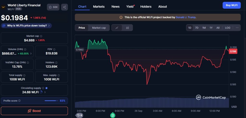 Ce n’est pas une simple correction : le token WLFI, au cœur du projet World Liberty Financial, a perdu près de 41 % en quelques semaines. Début septembre, il s’échangeait autour de 0,33 dollar. Aujourd’hui, il évolue péniblement autour des 0,19 dollar. Une claque pour les investisseurs qui espéraient surfer sur le “Trump effect”.