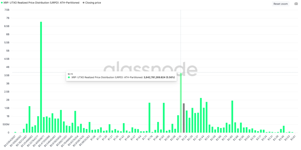 Repasser au-dessus des 2.15 $ n’est pas anodin. Ce niveau a servi de support majeur lors de plusieurs phases clés du marché, et il correspond à la zone où les investisseurs ont acquis près de 3.6 milliards de tokens, selon le modèle URPD de Glassnode.