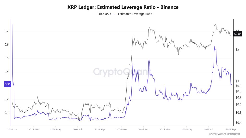 Le premier signal vient du marché des produits dérivés. Le niveau des positions ouvertes (open interest) sur les contrats à terme XRP a chuté passant de 11 à 7,5 milliards $. En d’autres termes, cela traduit une certaine réduction de l’exposition spéculative. En parallèle, le ratio de levier estimé sur Binance est revenu à sa moyenne annuelle.