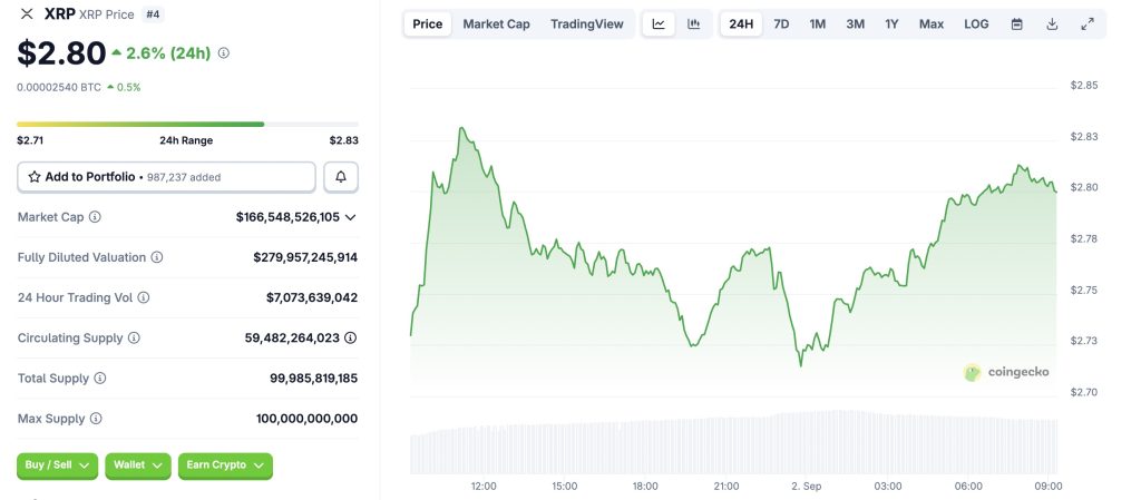 Fin août, XRP a reculé de 2,85 $ à 2,75 $, une baisse de près de 4 % en vingt-quatre heures. Plusieurs analyses attribuent cette chute à des ventes institutionnelles massives, estimées à 1,9 milliard de dollars depuis juillet. Ce reflux aurait pu déclencher un mouvement plus marqué, mais les whales ont choisi d’agir à contre-courant en renforçant leurs positions.