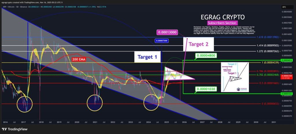 Le ratio XRP/BTC n’a presque pas bougé depuis plusieurs semaines. Pourtant, derrière cette apparente inertie, un phénomène technique peu commun est en train de se former. Le mouvement est discret, mais il ne passe pas inaperçu. EGRAG CRYPTO vient de publier une analyse détaillée qui attire beaucoup d’attention.