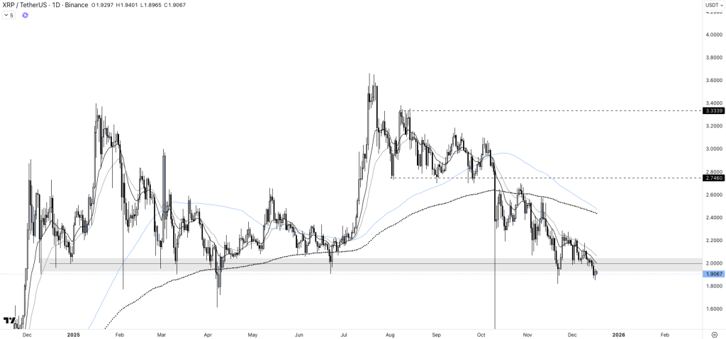 Pour le XRP, plusieurs lectures techniques convergent vers une zone charnière autour de 2,00 $, souvent décrite comme un pivot psychologique et graphique. Le fait de rechuter sous des niveaux suivis à court terme (autour de 1,93 $ selon certaines analyses) alimente l’idée d’un marché repassé en contrôle vendeur, avec volumes et structure de prix moins favorables.