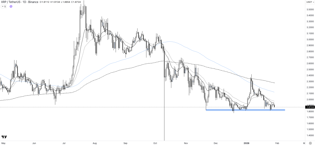 Sur le plan graphique, le marché a donné des repères. Mi-janvier, XRP a brièvement accéléré au-dessus de 2,14 $ et a touché 2,17 $ avant de rechuter. Depuis, l’attention se situe autour de la zone 1,85–1,90 $ : tant que ce support tient, le scénario d’un rebond technique reste crédible. En revanche, une cassure nette sous cette zone ouvrirait mécaniquement la porte à une phase de correction plus profonde, alimentée par des effets de levier qui se dégonflent vite lorsque la volatilité remonte.