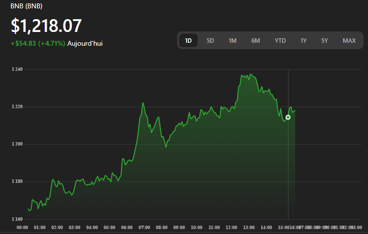 Le meilleur exemple reste BNB, qui s’impose comme l’exception. Le token affiche +17 % sur la semaine, atteignant 1 184 $, preuve que la rotation des capitaux entre écosystèmes est toujours en cours.