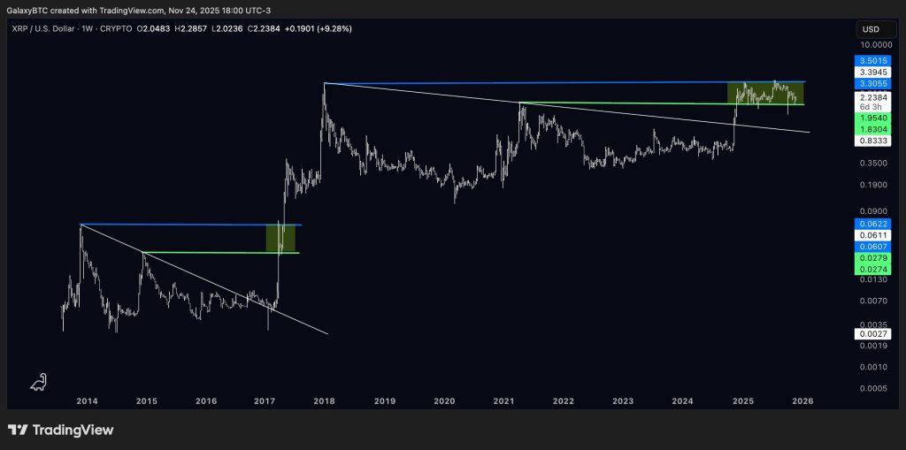 Un autre élément attire l’attention. L’analyste GalaxyBTC observe que la structure actuelle de XRP ressemble fortement à celle qui avait précédé l’explosion de 2017.