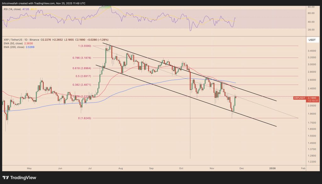 Ce seuil symbolique des 2 $ n’a pas cédé. Au contraire, il a servi de rampe de lancement, comme il l’avait déjà fait à plusieurs reprises depuis fin 2024. La zone 1,95 – 2,05 $ s’impose comme le cœur d’un canal parallèle dans lequel XRP évolue depuis près d’un an. Chaque retest sérieux de cette bande s’est soldé par un rallye puissant, parfois de 75 à 90 %.