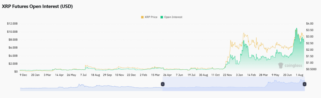 Les données de marché confirment ce basculement. Le volume d’échanges sur XRP a bondi de 25 %, atteignant plus de 10,2 milliards $. Pourtant, l’ensemble des positions ouvertes a reculé de 5 % pour s’établir à 7,48 milliards $. Autrement dit, des positions ont été fermées plutôt qu’ajoutées.