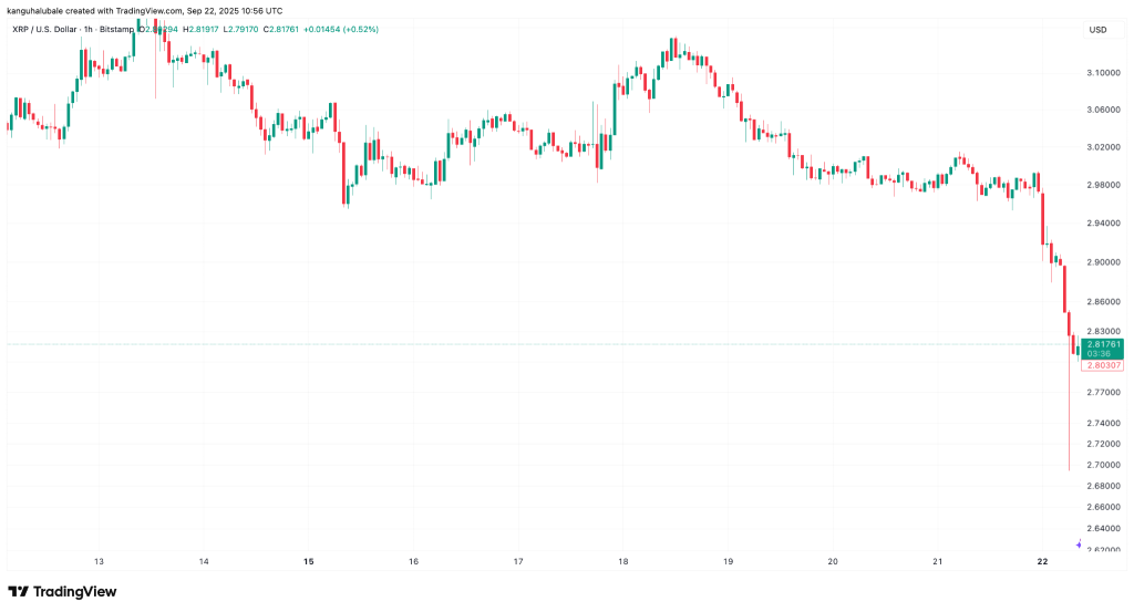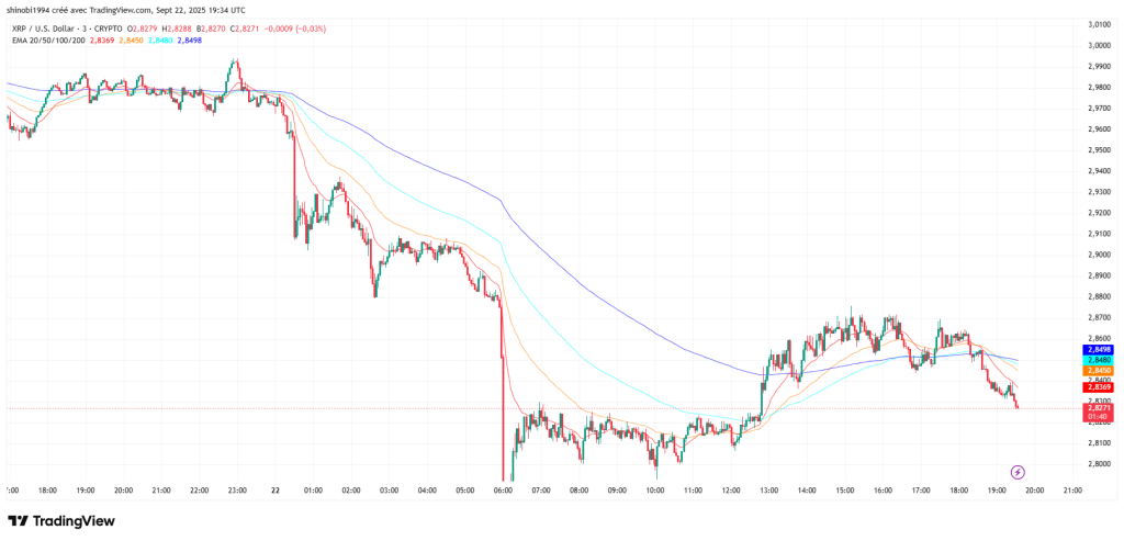 Ce lundi, le XRP est repassé sous la barre des 3 $, perdant près de 5 % en 24 heures pour s’établir autour de 2,80 $. Après plusieurs tentatives infructueuses de tenir au-dessus de ce seuil, l’altcoin entre dans une zone d’incertitude. La question est désormais simple : s’agit-il d’une correction technique saine ou du début d’un effondrement plus marqué ?