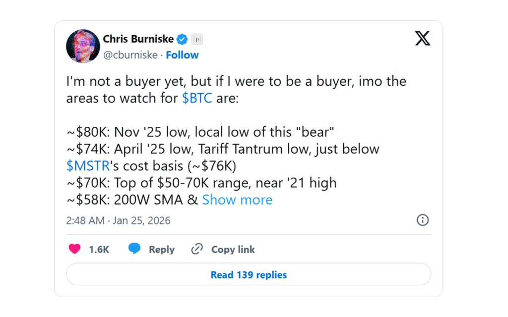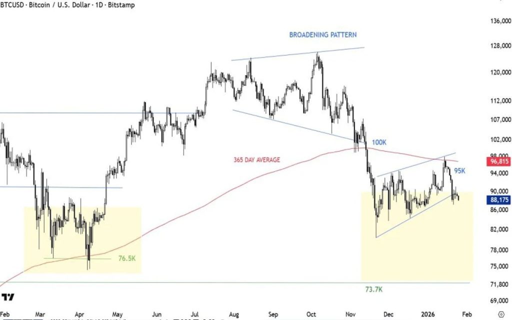 Χαμηλότερα, ο Burniske εστιάζει στα 74.000 δολάρια, επίπεδο που συνδέεται με το χαμηλό του Απριλίου 2025 και το οποίο χαρακτηρίζει ως το σημείο έντονης πίεσης από τους δασμούς εκείνης της περιόδου.